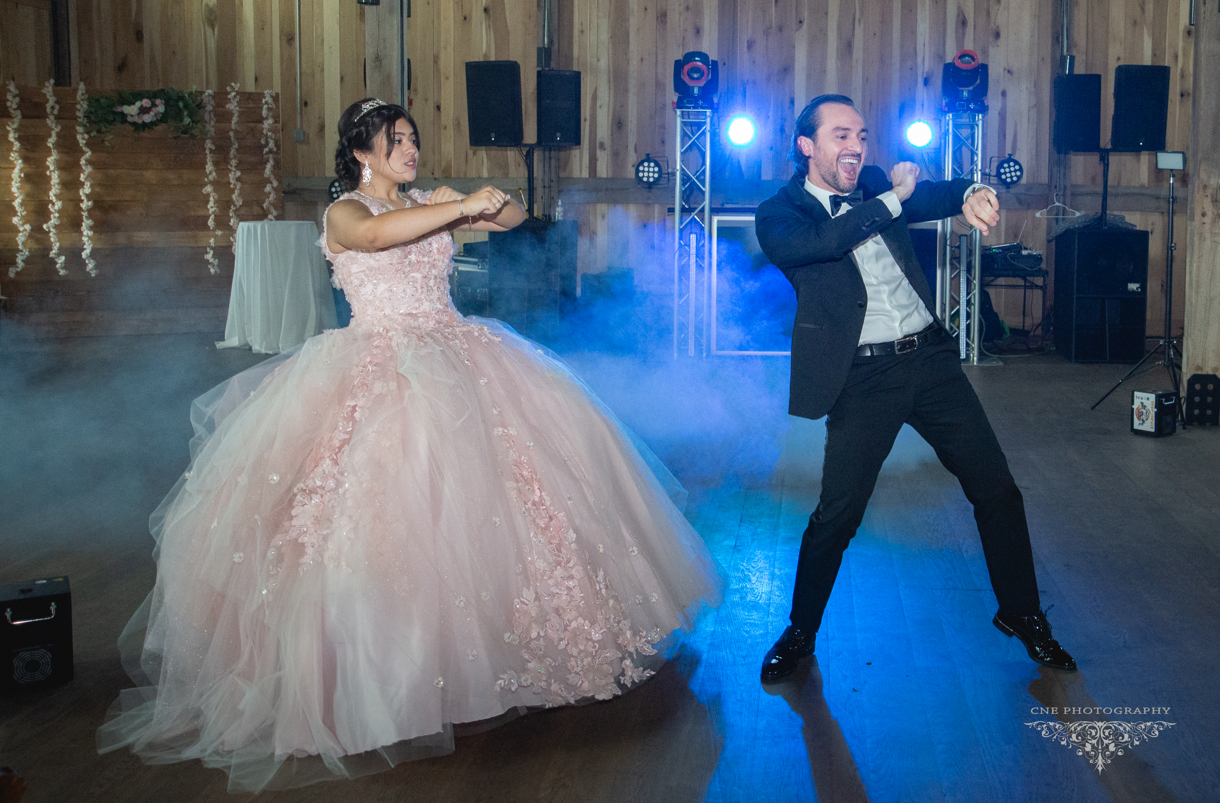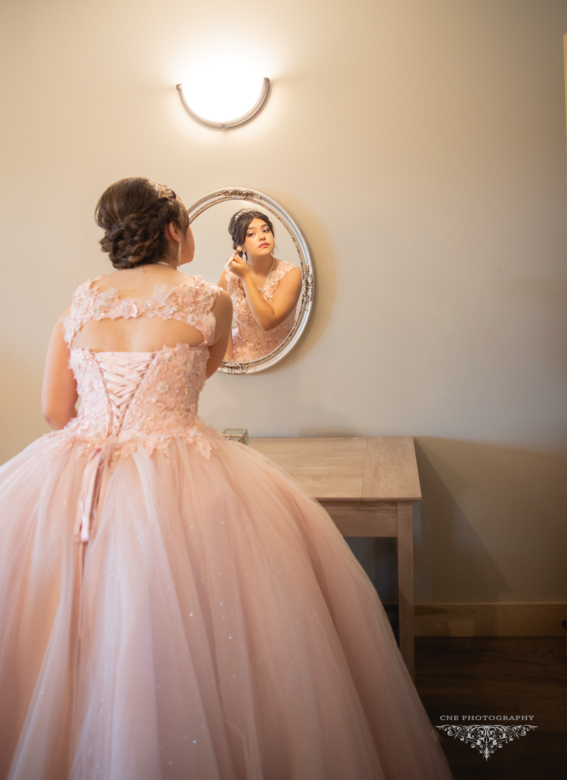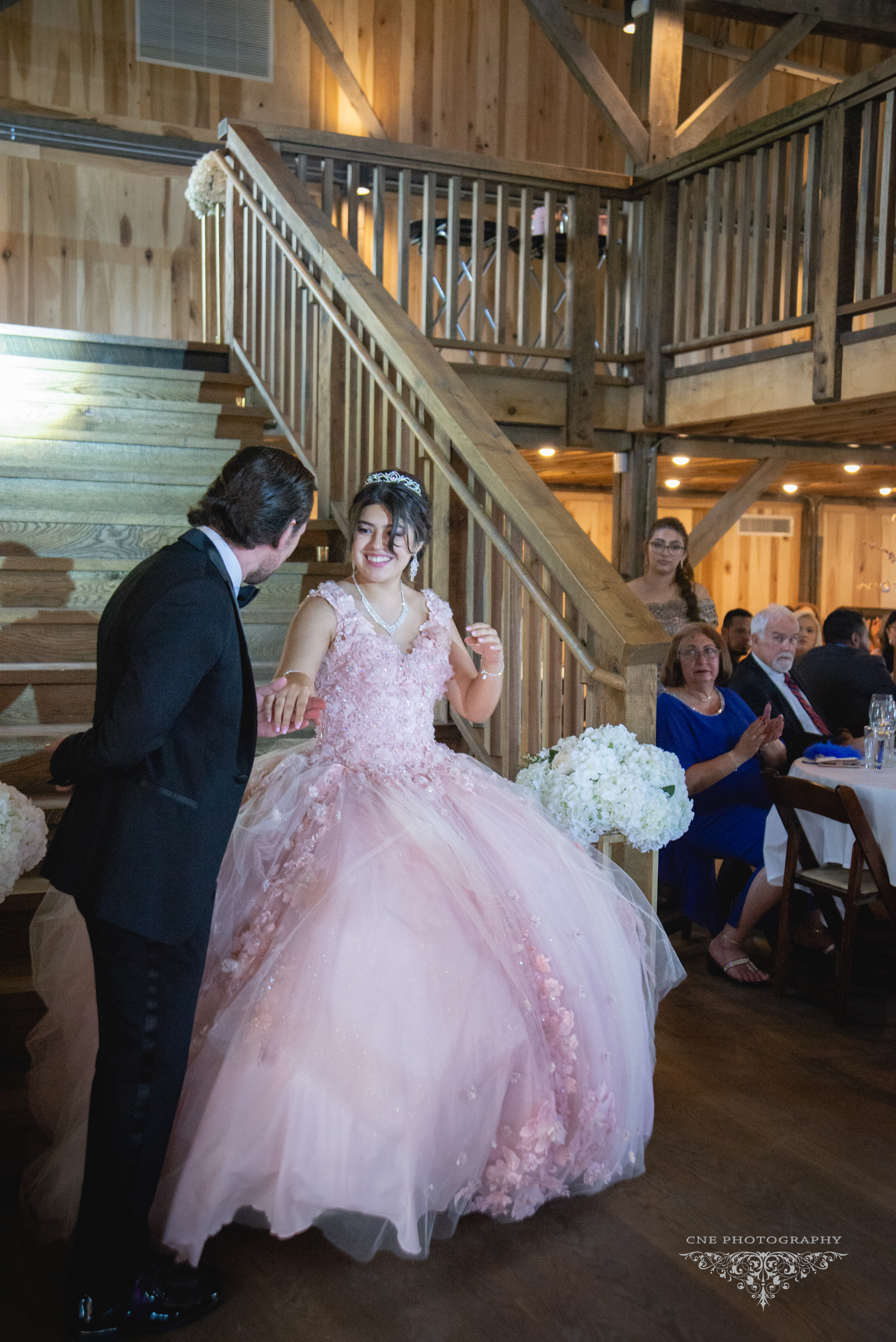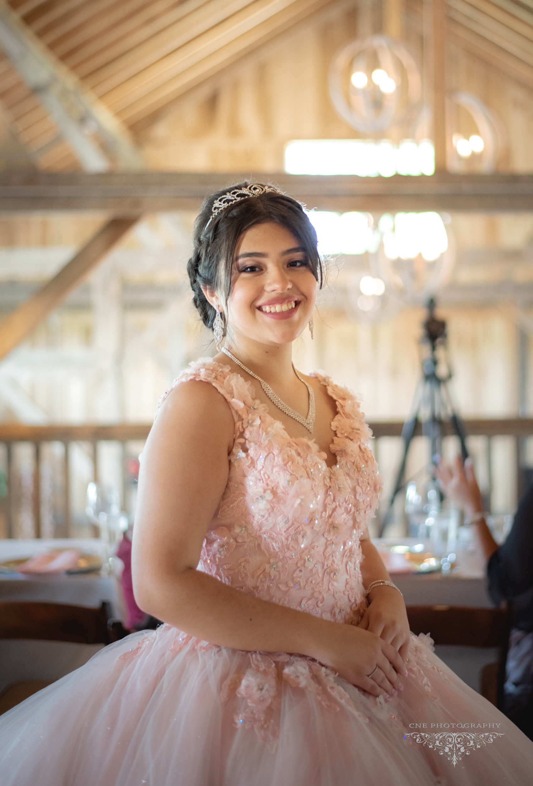 The party I recently photographed was held in a beautiful barn venue called Ritz Charles Lindley farmstead at chatham-hills which added to the charm and elegance of the event. The decorations were a beautiful mix of pink pastel flowers that matched the Quinceañera’s dress perfectly; the whole venue was beautifully lit with warm, soft lighting. The Quinceañera looked absolutely stunning in her dress, and her joy and happiness was contagious. The party was filled with family and friends, all there to celebrate this special occasion with her.